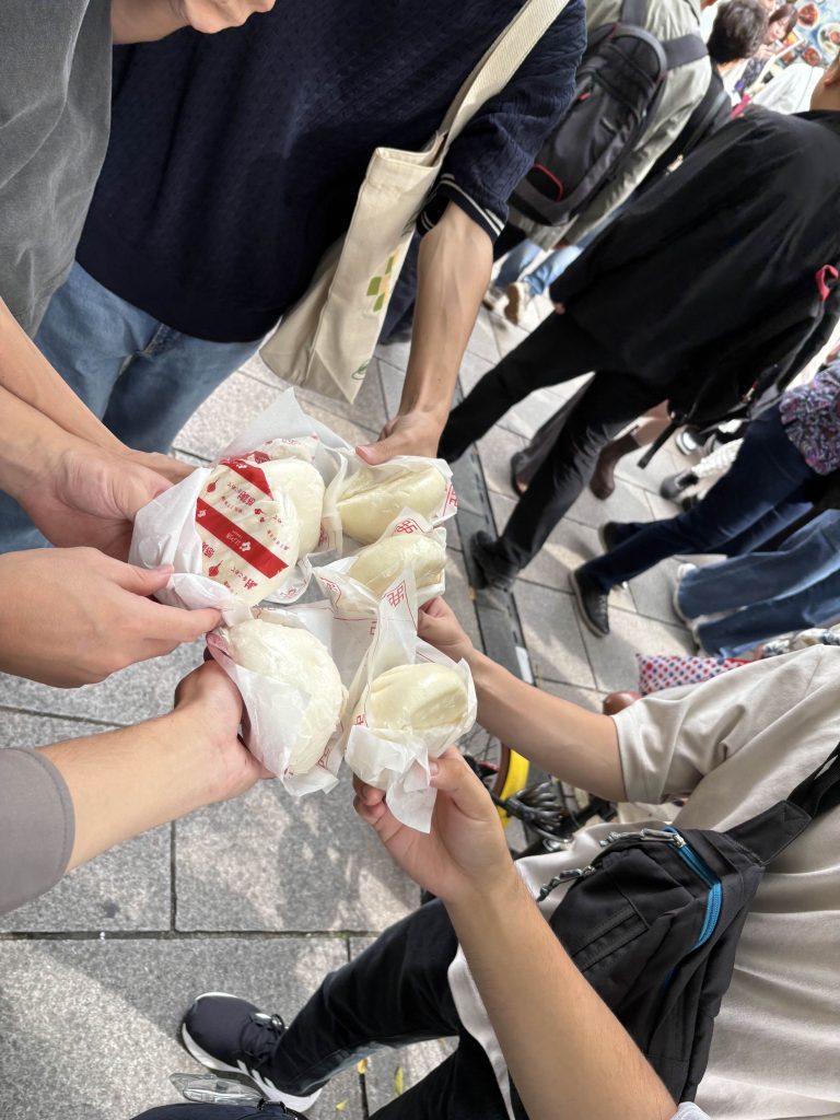 観光当日、お昼前くらいに元町・中華街駅に現地集合しました。3連休の中日とあって、やはりものすごい人混みでした。全員腹ペコで、とりあえず中華街といえば肉まん・小籠包だろうと話しながら進んでいると、おいしそうな肉まんのお店と小籠包のお店を見つけました。二手に分かれて、それぞれ購入してきました。
