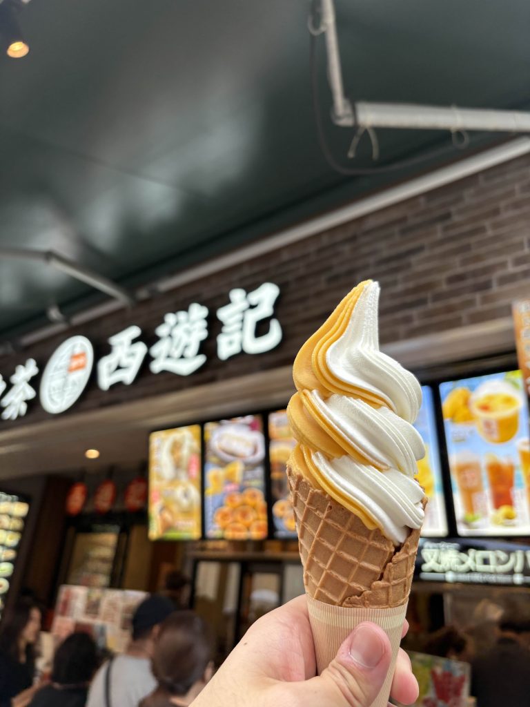 個人で色々食べたいデザートを探し回り、私は杏仁マンゴーミックスのソフトクリームを食べました。これもおいしくて、コーンの底までたっぷりで満足しました。(底までたっぷりなので下からすぐ垂れてきて少し大変でした)